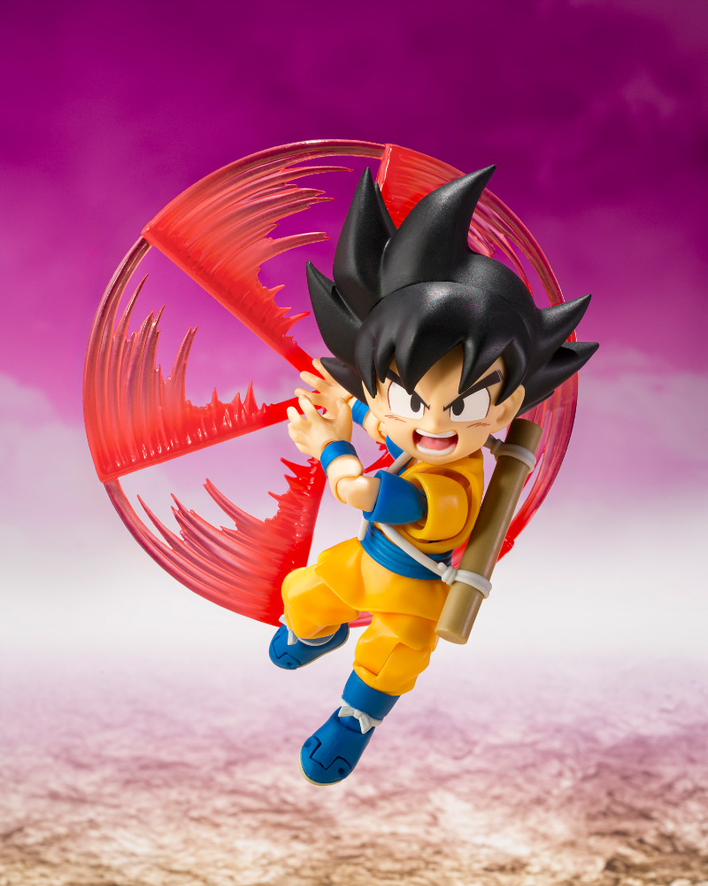 En total, se incluyen cinco caras: sonriente, fulminante, con los dientes apretados, riendo y sorprendida. ¡Realmente puedes disfrutar de toda la gama de emociones de Gomah! ¡Incluye tres piezas de Nyoibo , que se pueden usar con la figura SHFiguarts Son Goku (Mini) -DAIMA- (se vende por separado)!